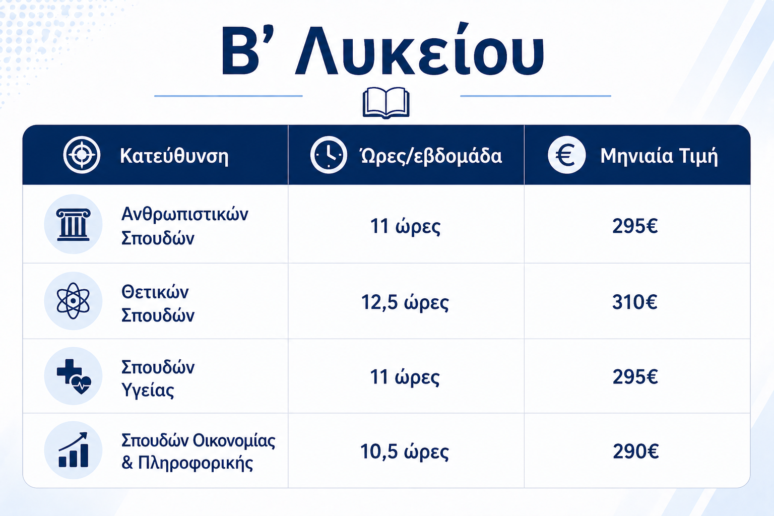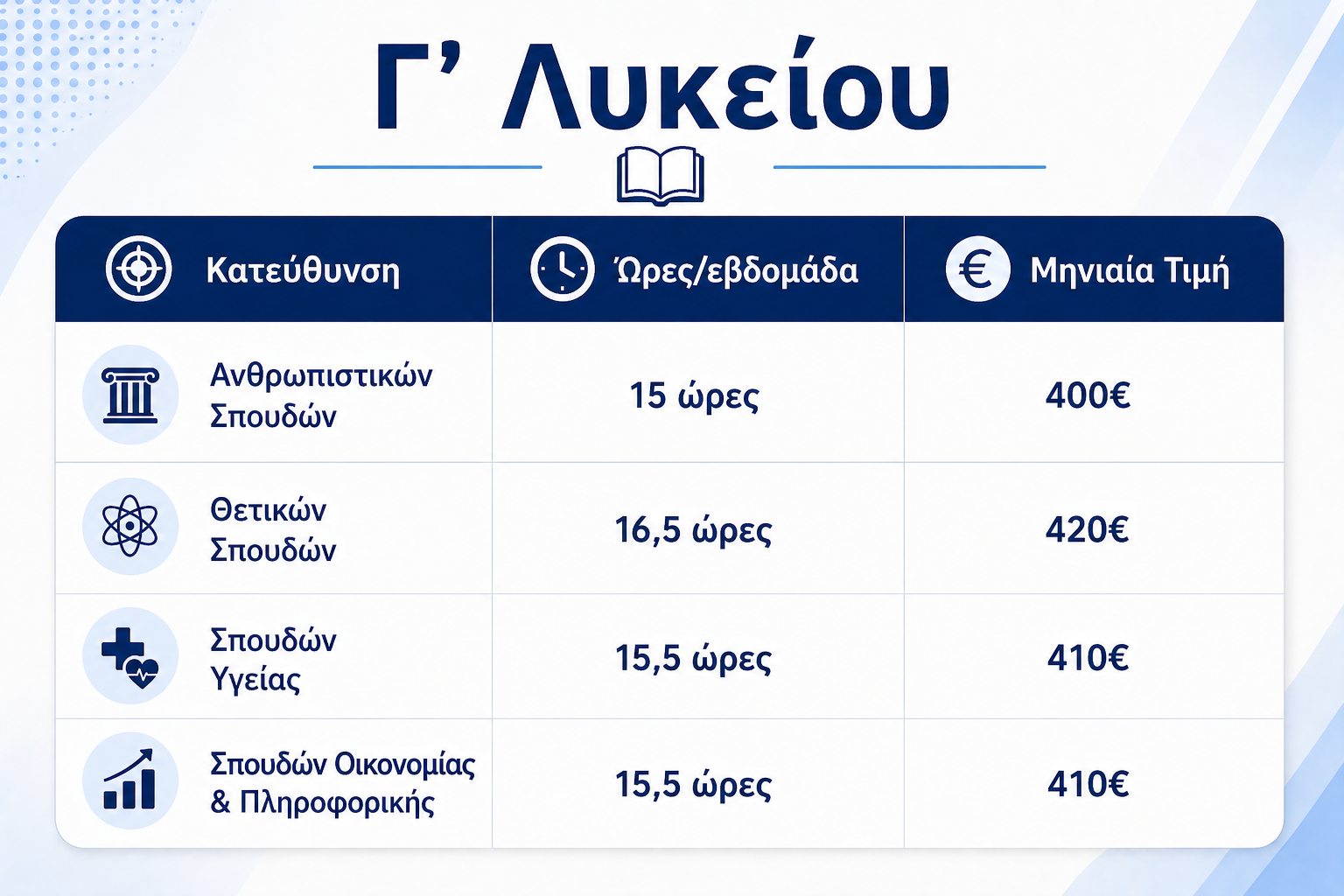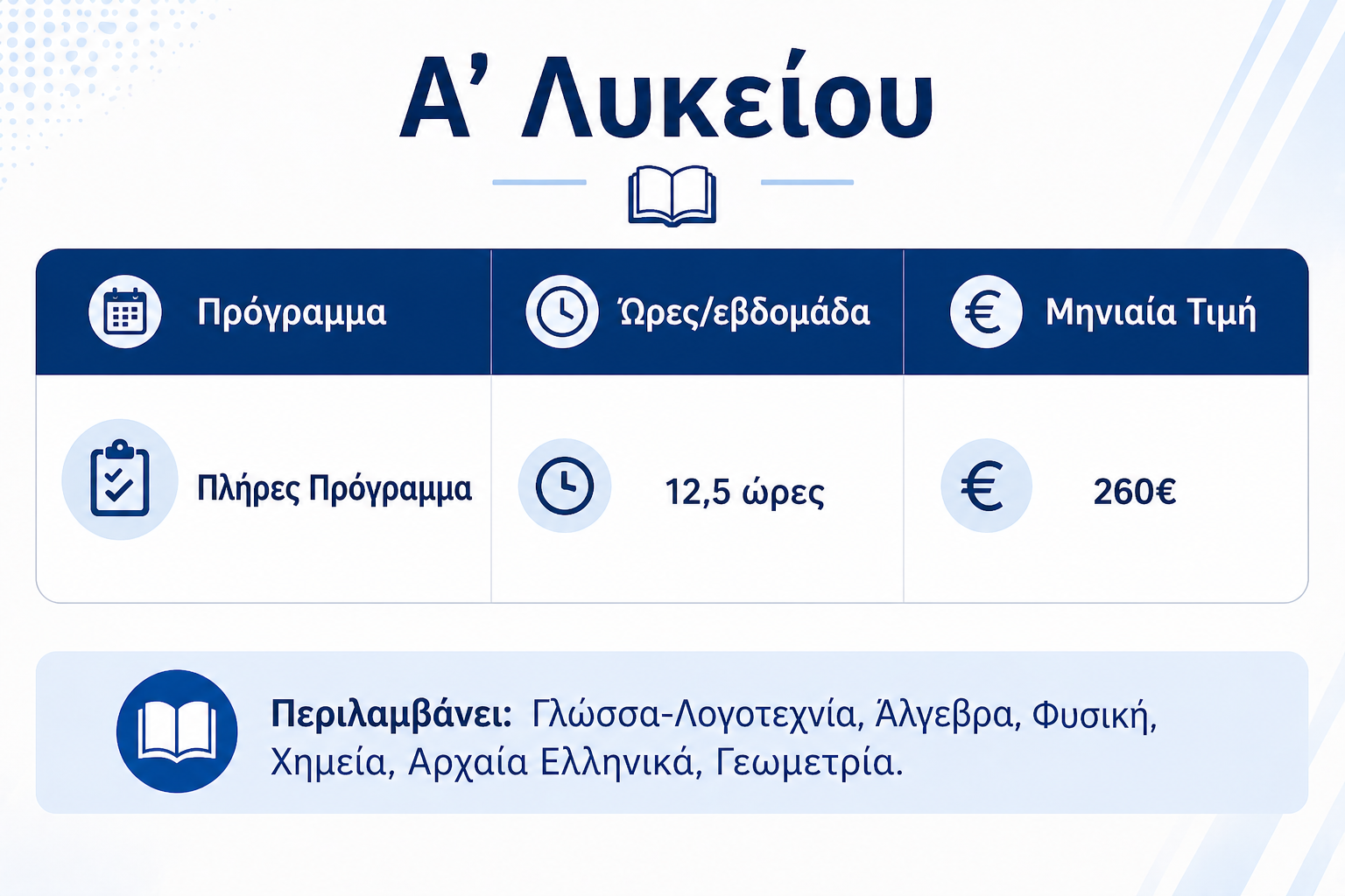 Αν ο μαθητής χρειάζεται μόνο συγκεκριμένα μαθήματα, η τιμή διαμορφώνεται αναλόγως — επικοινωνήστε μαζί μας για προσαρμοσμένη πρόταση.